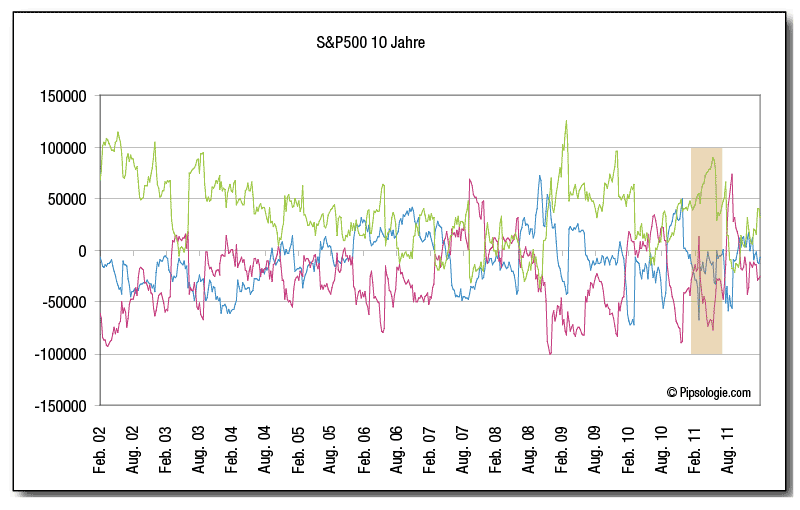 Ich poste hier den COT Report Index des S&P500 der letzten 10 Jahre. Es fällt dabei auf, dass kurz vor Kurseinbrüchen Kommerzielle und Nicht-Kommerzielle weit auseinanderliegen und Nicht Meldepflichtige stark positioniert sind (Beispiel von Ende Juli 11 im orangen Rechteck). Diese Situation haben wir im Moment eindeutig nicht. Ich sehe daher weiter Aufstiege für möglich.